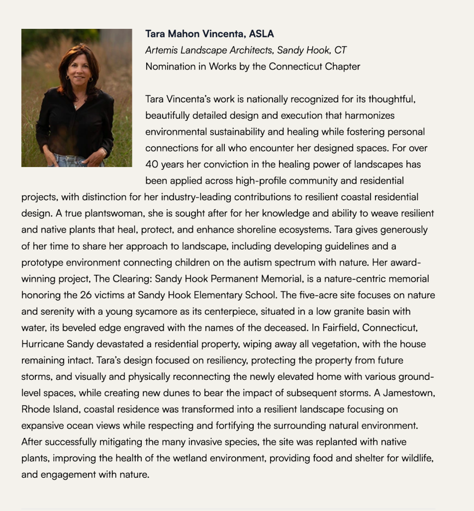 2025 ASLA Fellow In October 2025, Tara Vincenta was inducted into the American Society of Landscape Architects Council of Fellows in the Works category. Election to the ASLA Council of Fellows is among the highest honors the ASLA bestows on members.